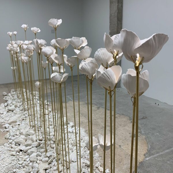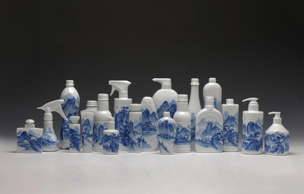 One of the most striking pieces comes from Chinese artist Wan Liya. His installation, Thousands Kilometers Landscapes, stretches eleven metres long and is made up of 250 porcelain bottles painted in deep cobalt blue. Inspired by ancient Chinese scrolls, it brings together French perfumery and Eastern craftsmanship in a quiet, flowing dialogue.