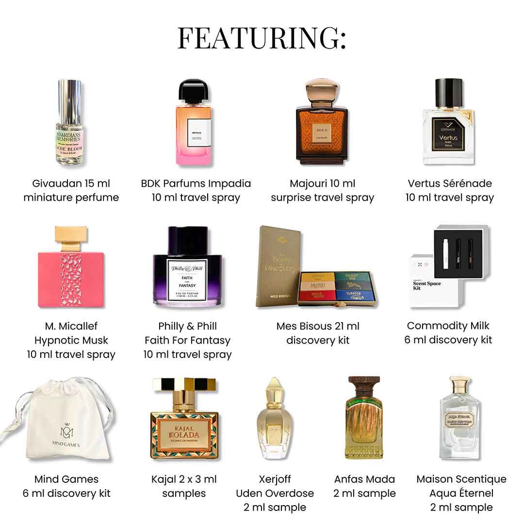 Le Parfum Experience Box is a curated discovery box that brings the storytelling of Le Parfum Magazine to life through scent. Each limited-edition box features a handpicked selection of niche perfume goodies, directly linked to the brands and features in the magazine. It’s an immersive way to explore, test, and connect with the world of artistic perfumery from the comfort of your home. Le Parfum Experience Box Chapter 6 contains 110 milliliters of perfume with a value of over €270, containing a mix of niche perfume goodies: samples (4x), travel sprays (5x), discovery kits (3x), and a miniature perfume (1)!